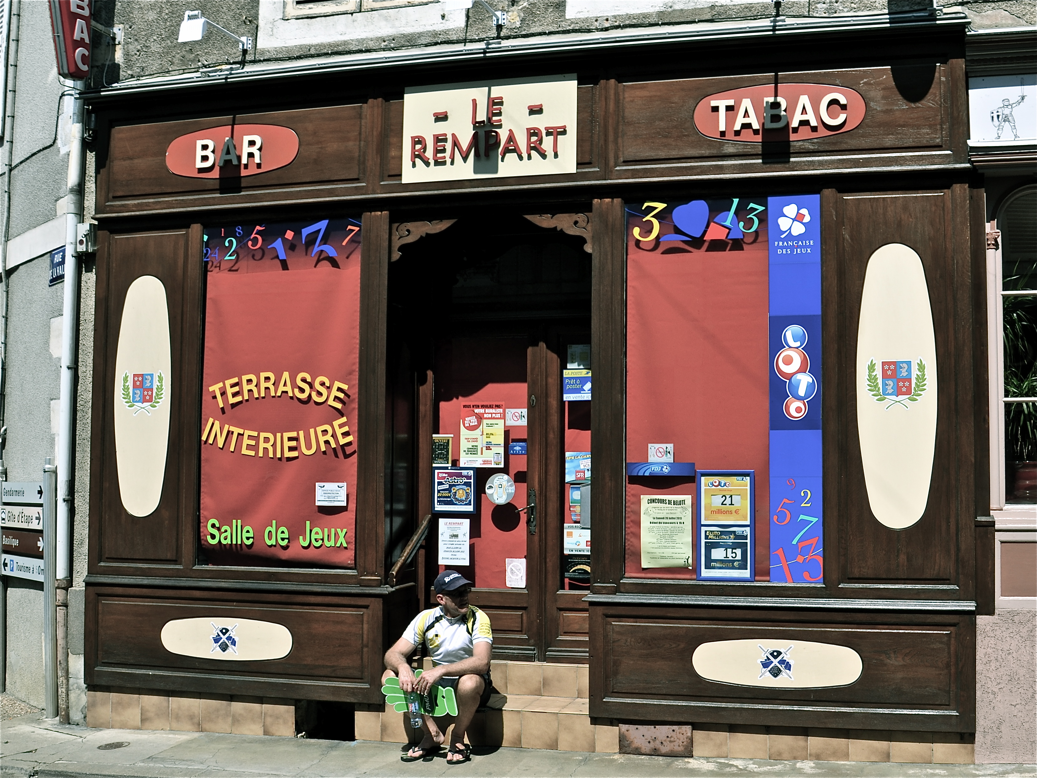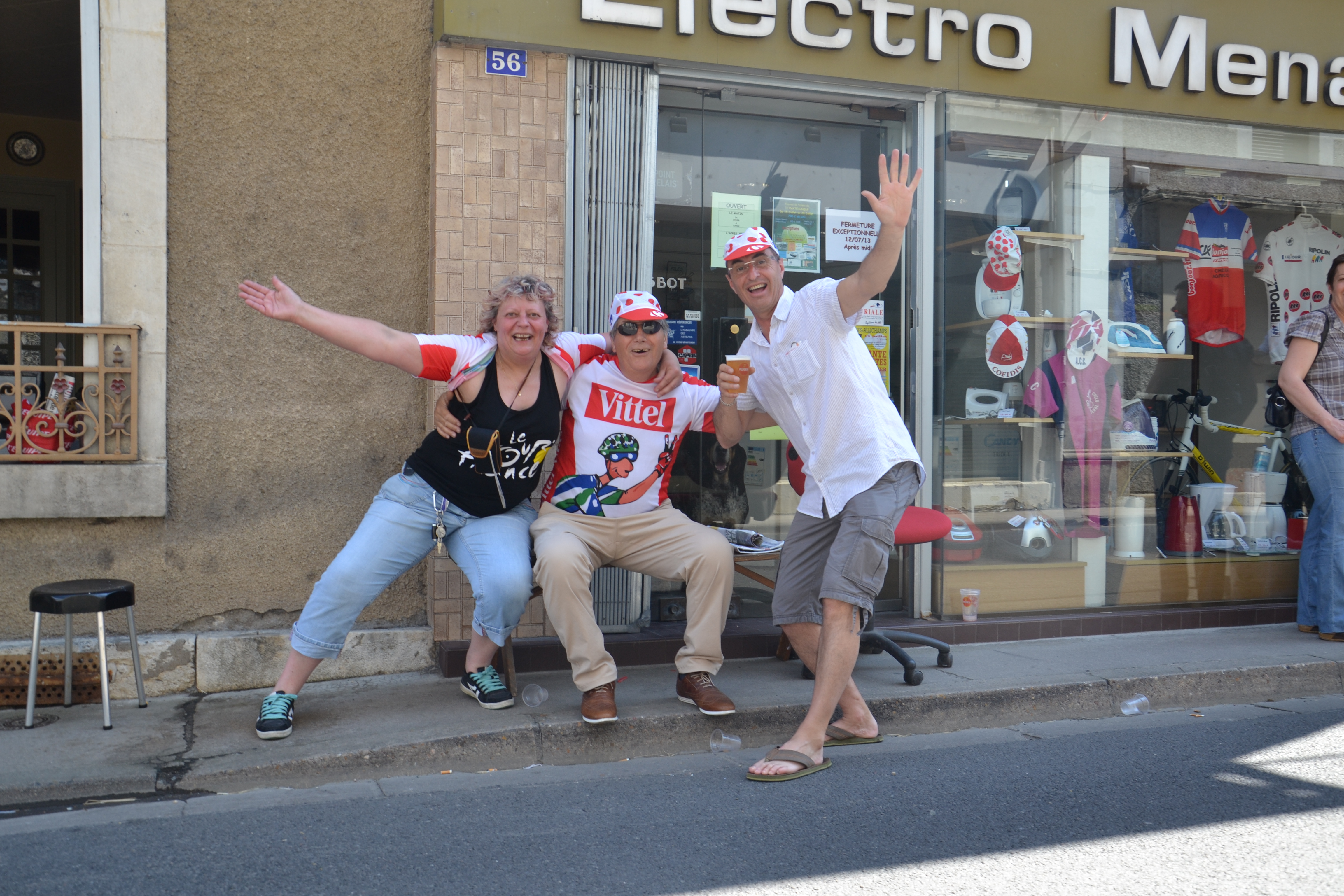 The caravan gone, spectators criss cross the road heading for the toilet or one of the numerous watering holes – what the French call “une buvette”- selling sodas or gassy beer. It’s hot, and the group of spectators next to me have enjoyed quite a few beers.