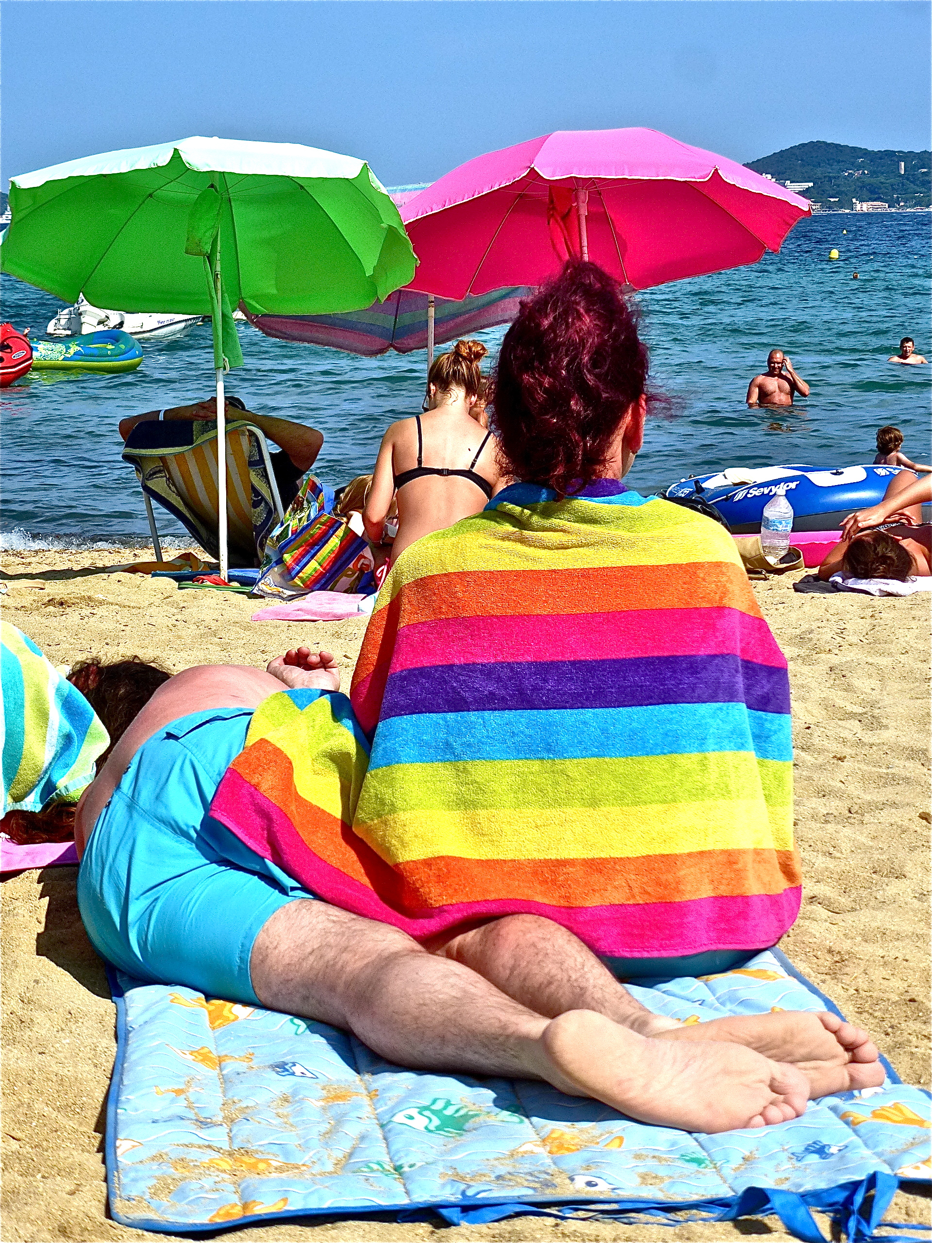 Once again besieged by a Dutch tribe, airbeds, parasols and their own garden furniture. I move down the beach next to a hoard of Brits. They spend the afternoon drink vast quantities of chilled rosé wine in the hot glaring, blazing sun. It is over 30°c. I suppose this is a case of « mad dogs and Englishmen ».