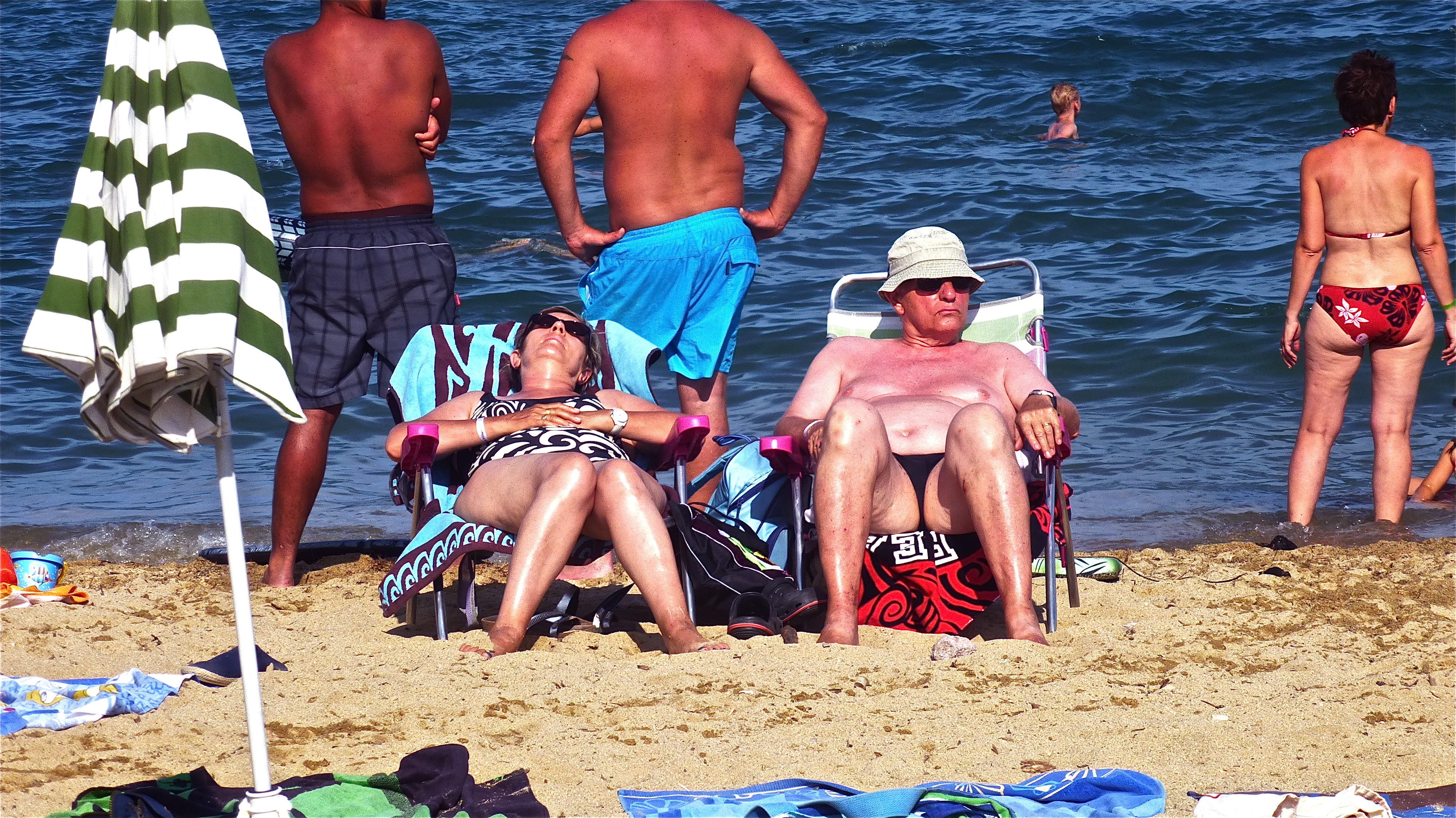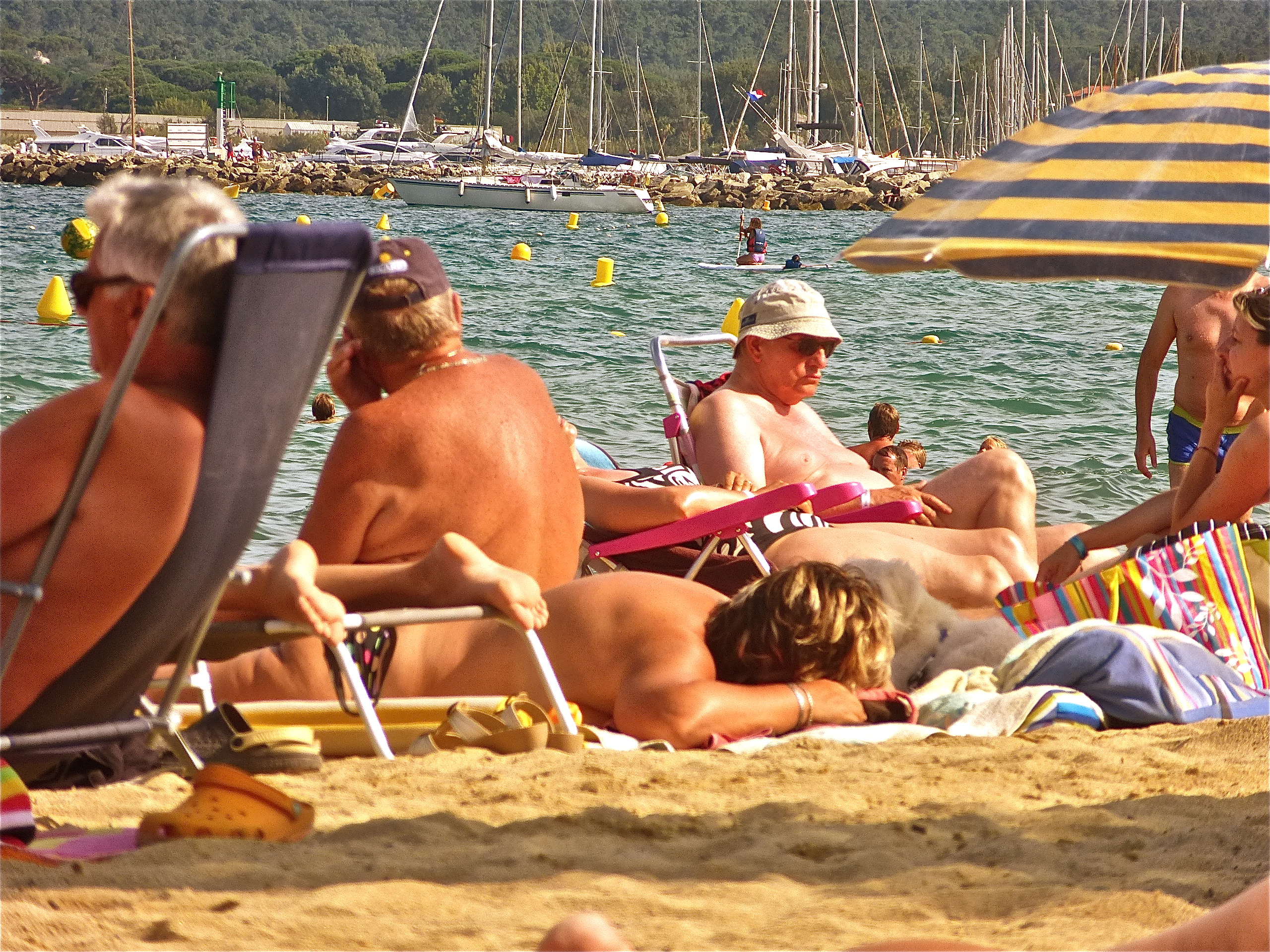 Time to unleash my flesh on an unsuspecting world. However, over this past year, my middle age spread has spread yet again. I am now what could be termed as flabby. This is the Côte d’Azur where every male is some kind of tanned and sculpted Adonis. I’m scared to take off my T-shirt. On a stroll along the beach though I observe very few « Chippendales » but plenty of flabby blokes grilling red like sides of beef roasting in the sun. It seems at St Tropez that fat is fashionable. Time to rip off the T-shirt and get grilling.