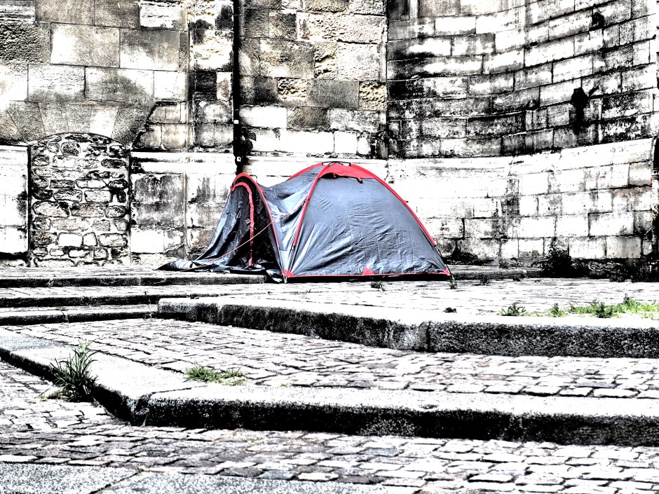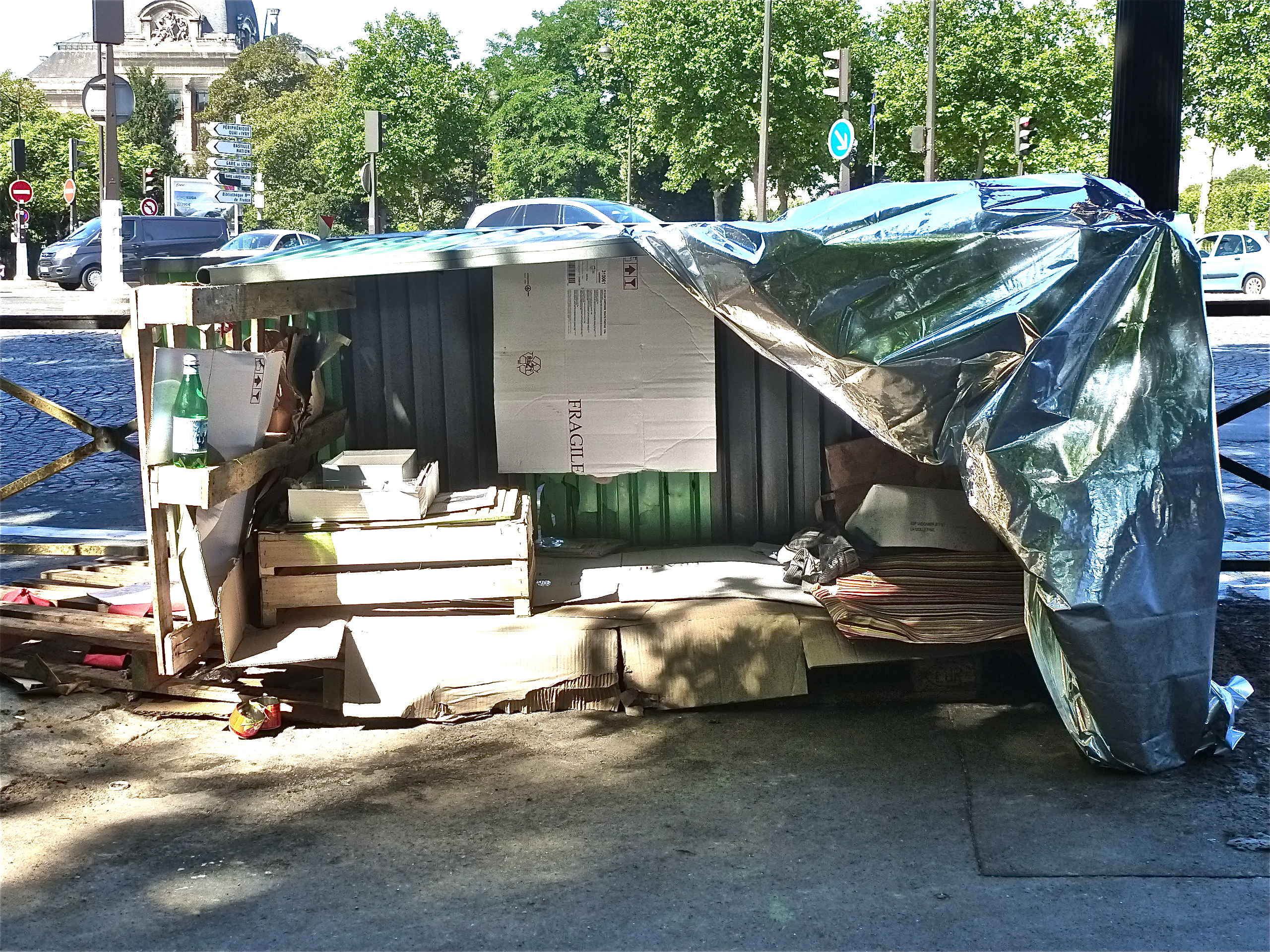 Tents spring up all over Paris. Immigrants, homeless people, the working poor. Pitch your tent on hallowed ground and more specifically on church proerty and the police cannot move you on. This is taken in the St Paul area just a short walk from the Paris City Hall.