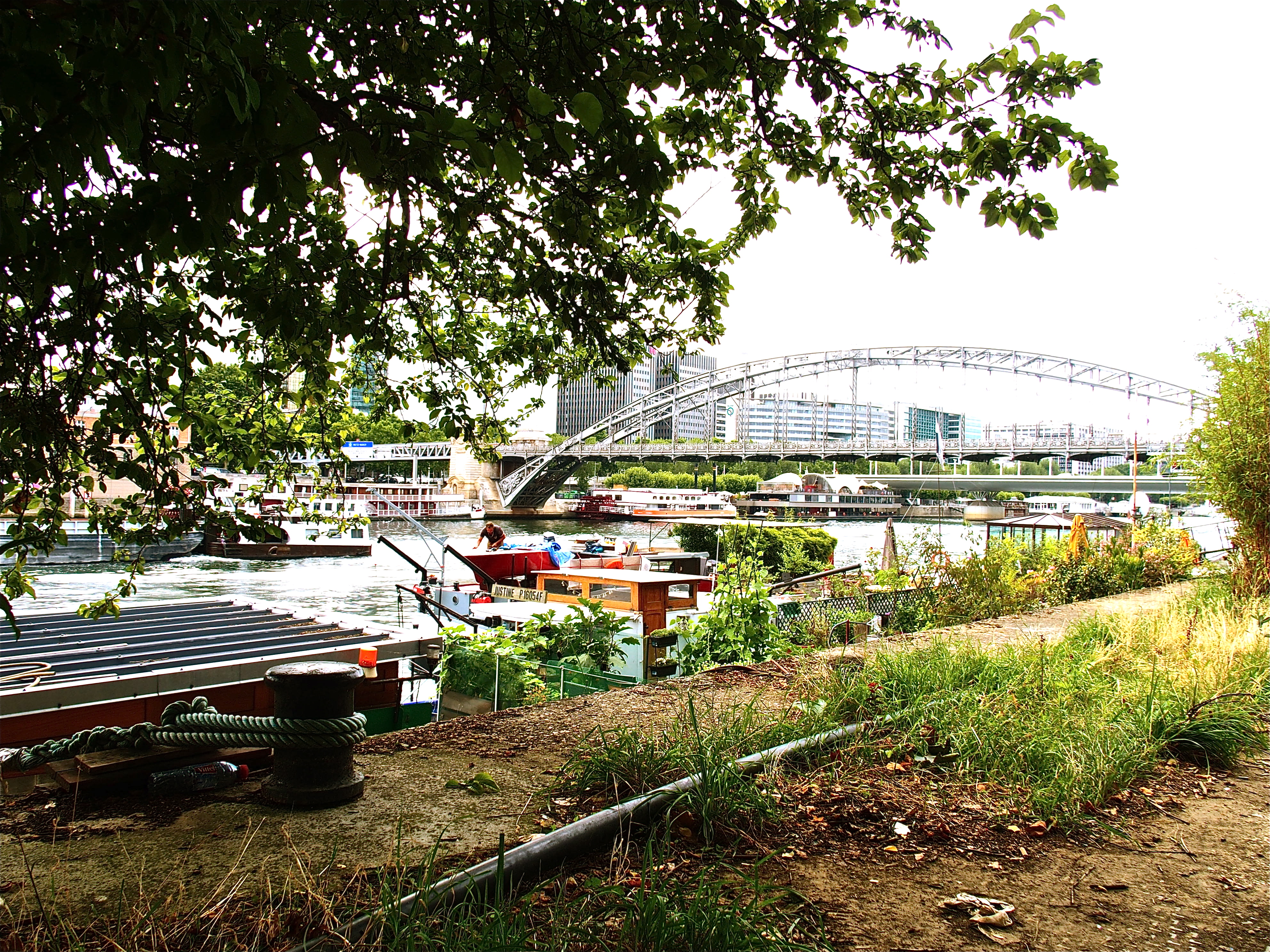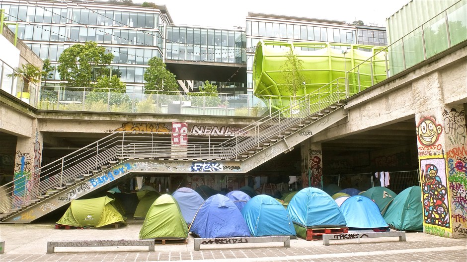 Tent city – homeless and immigrants pitch their tents at a new arts and media center on the banks of the Seine near Austerlitz station – the art centre was launched in great pomp a few years back as the first phase in the redevoloppment of the Paris docks – truth to ell, Paris has never had dacks like London or Amsterdam or Antwerp – this was a “call-in” quay for river barges. Camp cleared away late 2017, just before the Olympic Committee visited Paris.