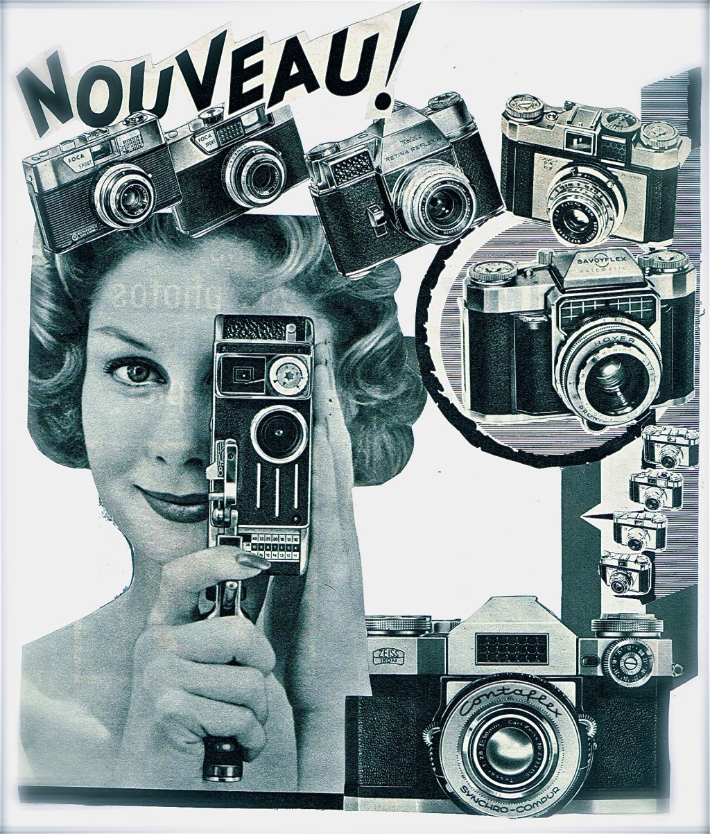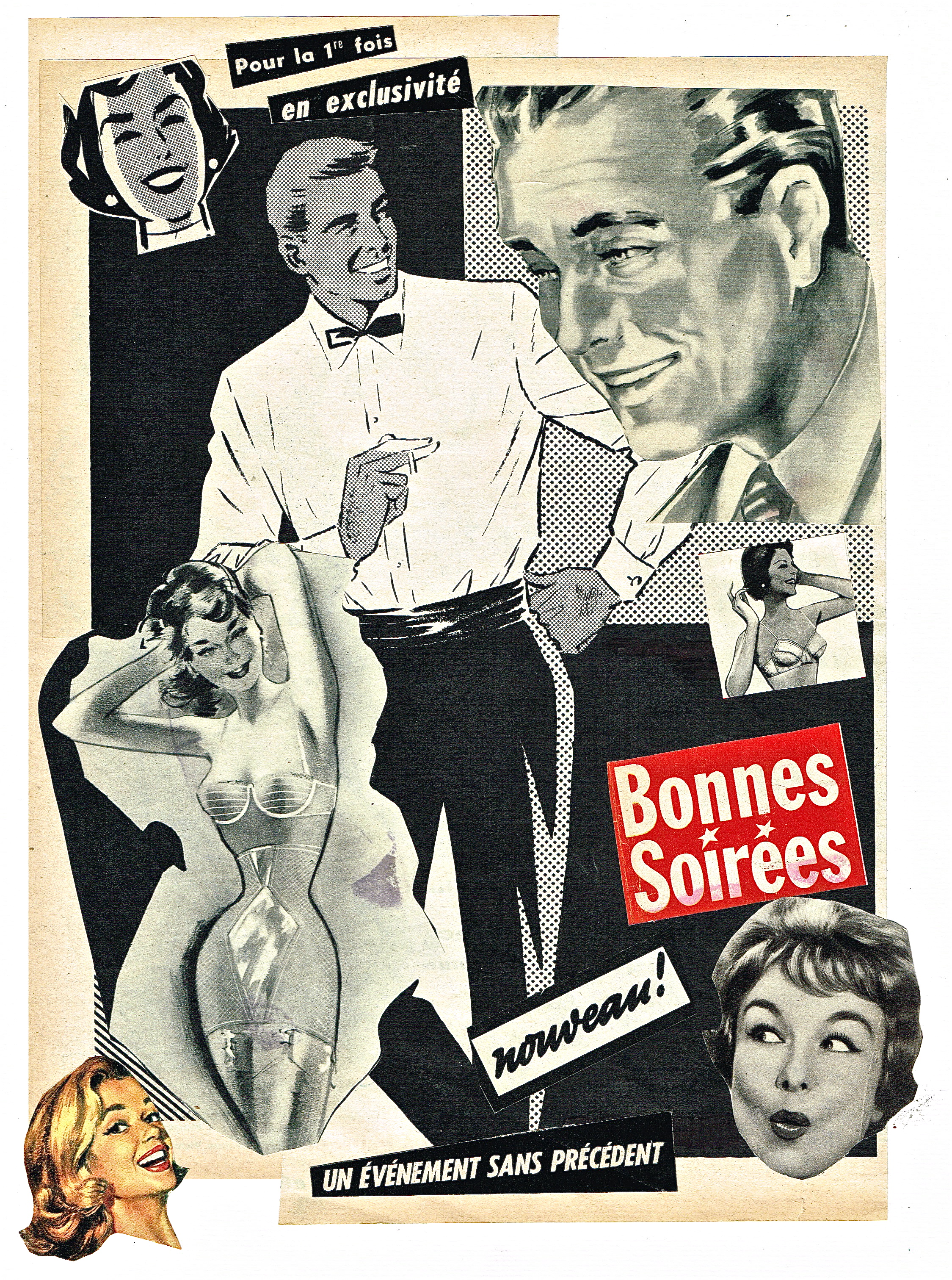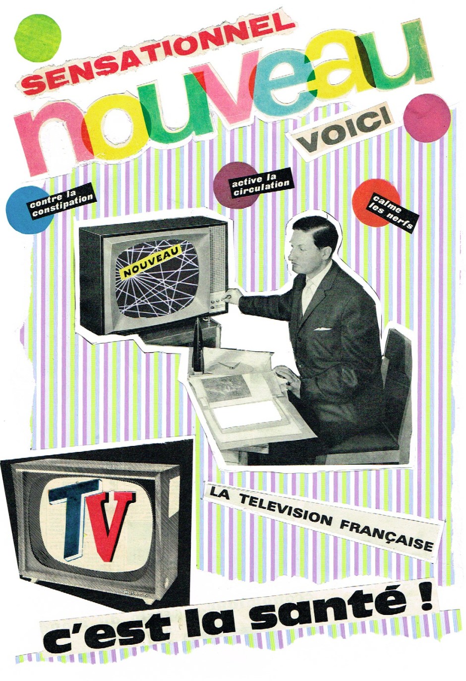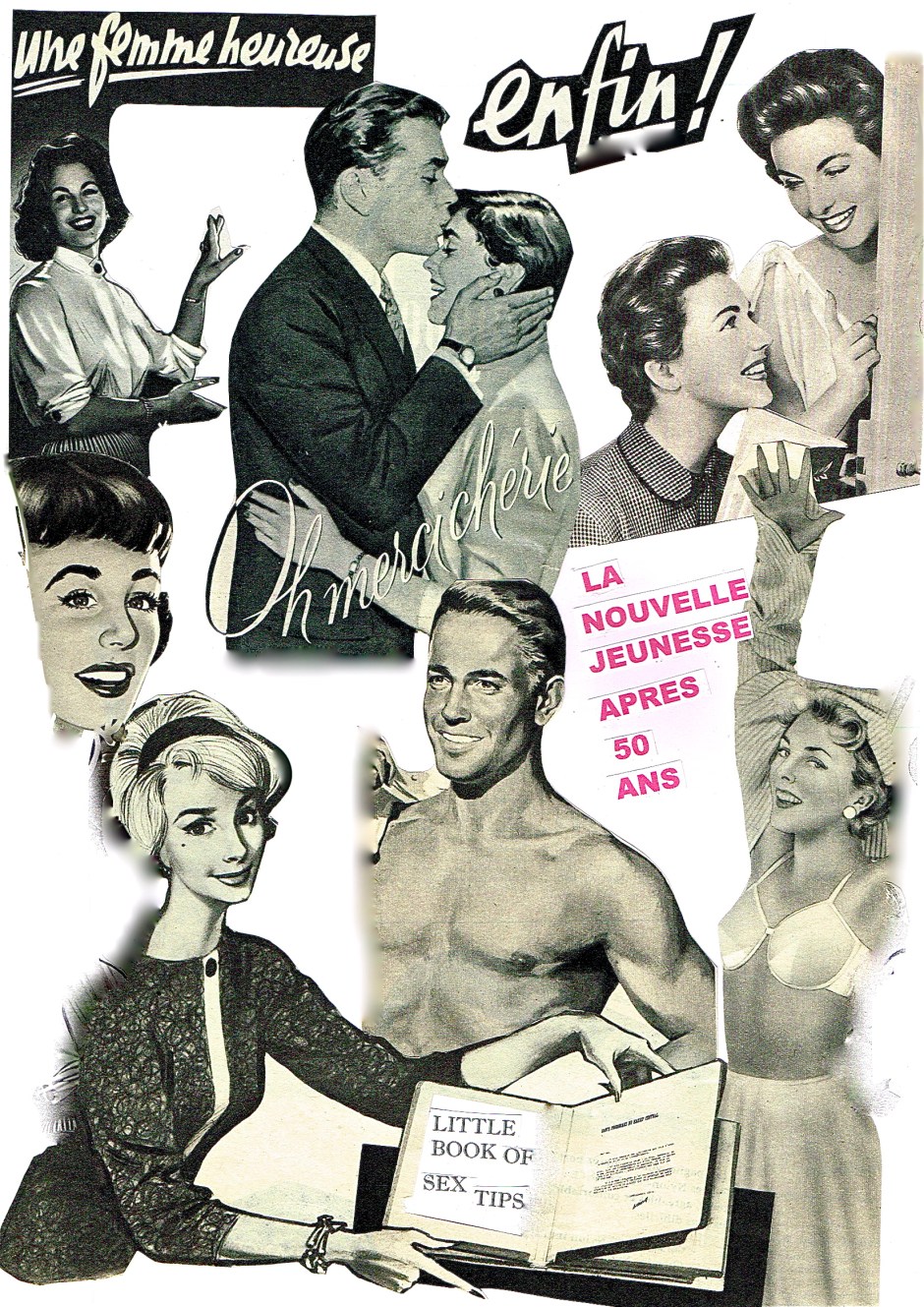 Coldest day of the year so far, laid low by a seasonal bug, perfect time just to mess about with a collage or two. Here is a selection of old and new collages All images culled from my collection of early 1960’s French magazines (Paris Match and Jours de France) – All magazines date from 1960 to 1962, after all magazines went glossy and the adverts went from using hand-drawn art to photography. Happy viewing.
