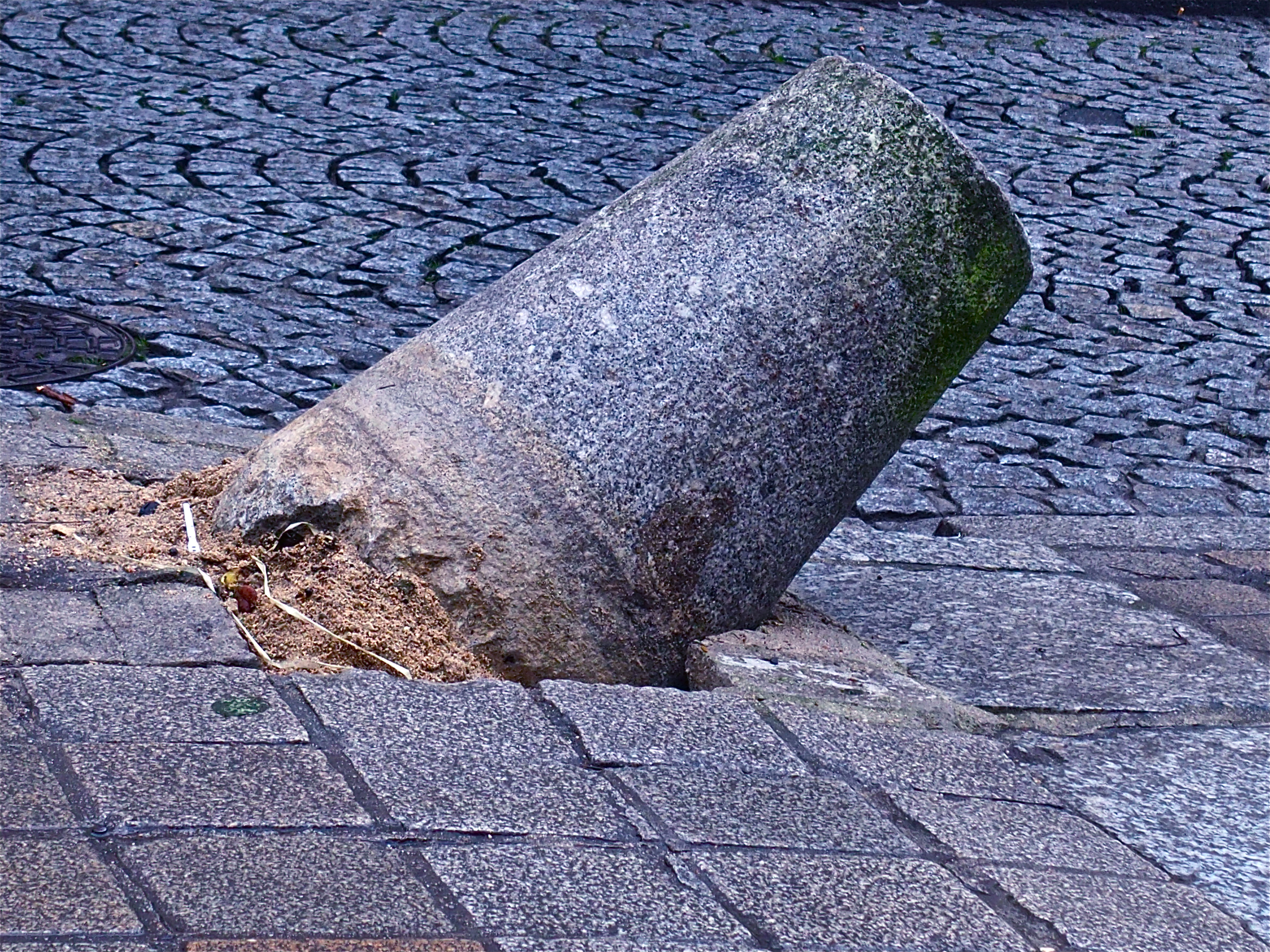 Walking downtown in the wake. It’s hardly an aftermath. I get talking to one shokeeper, he’s halfway up a ladder, electric drill in hand.
