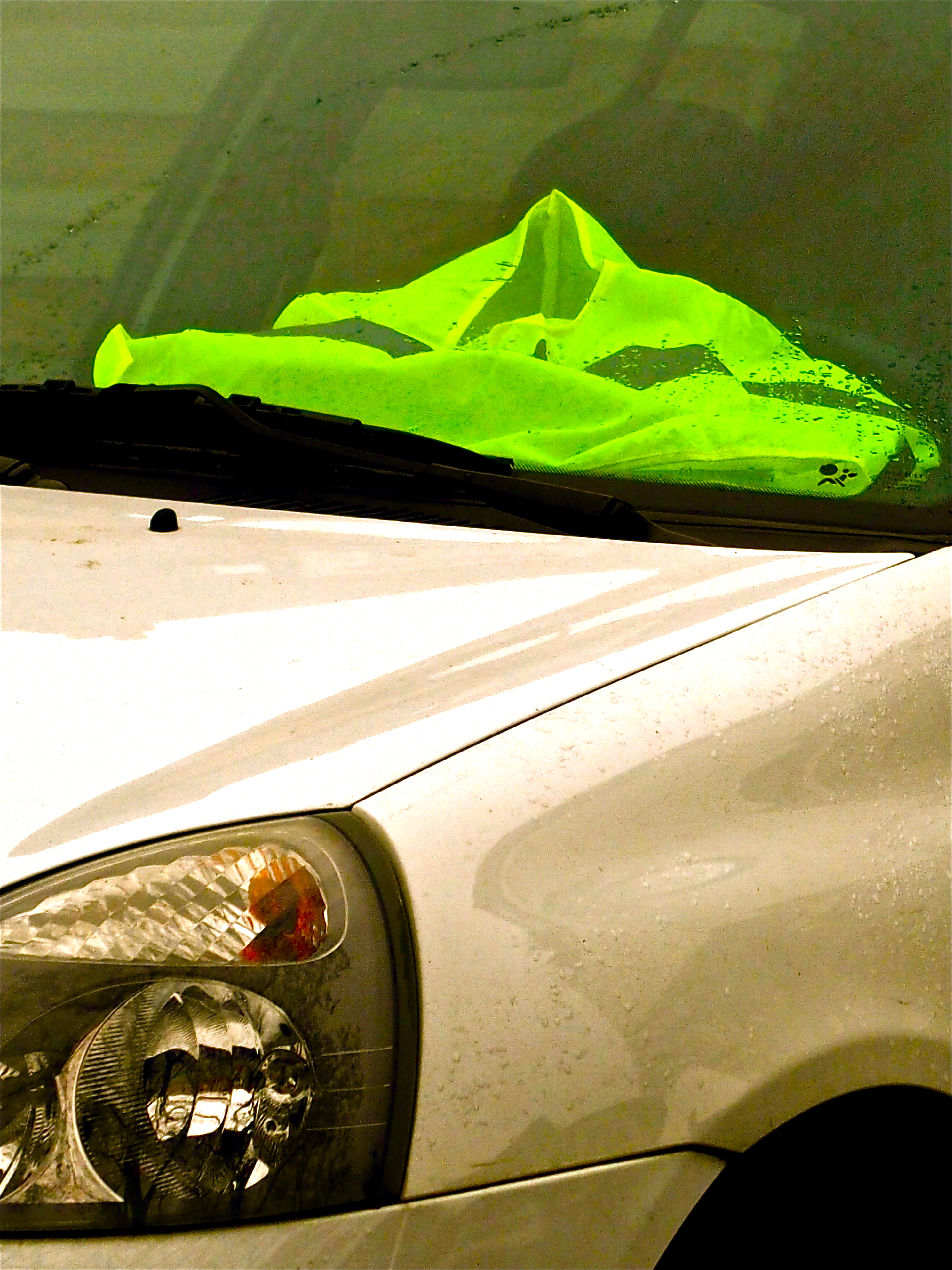 Walking across a car park, every car has a yellow vest on the dashboard in clear view, as if to say «Please don’t burn my car, I support you»