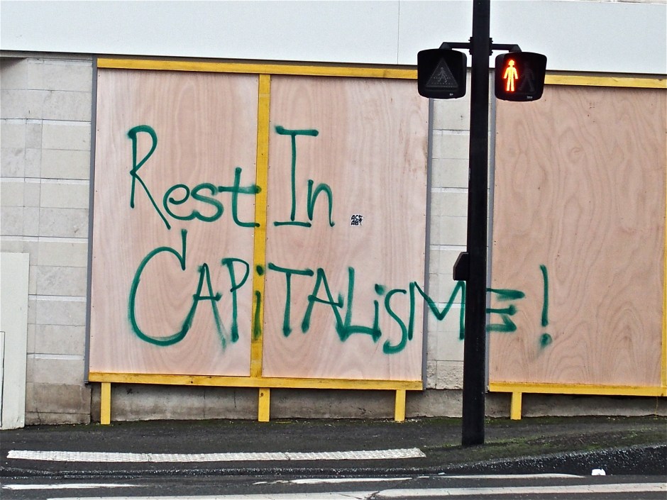 We were expecting Sunday mourning, with world clearing up post apocalypse, but the fears were unfounded, the town was never a battlefield, but fears confirmed, the hooligans did come to town to try and wreak weekend mayhem; – the pitched battle with the police never happened, there was no «reckoning» – just groups of masked and hooded «hooligans» overturning and burning dustbins, ripping up concrete bollards, and «signing» boarded up shopfronts with their revolutionary rhetoric.