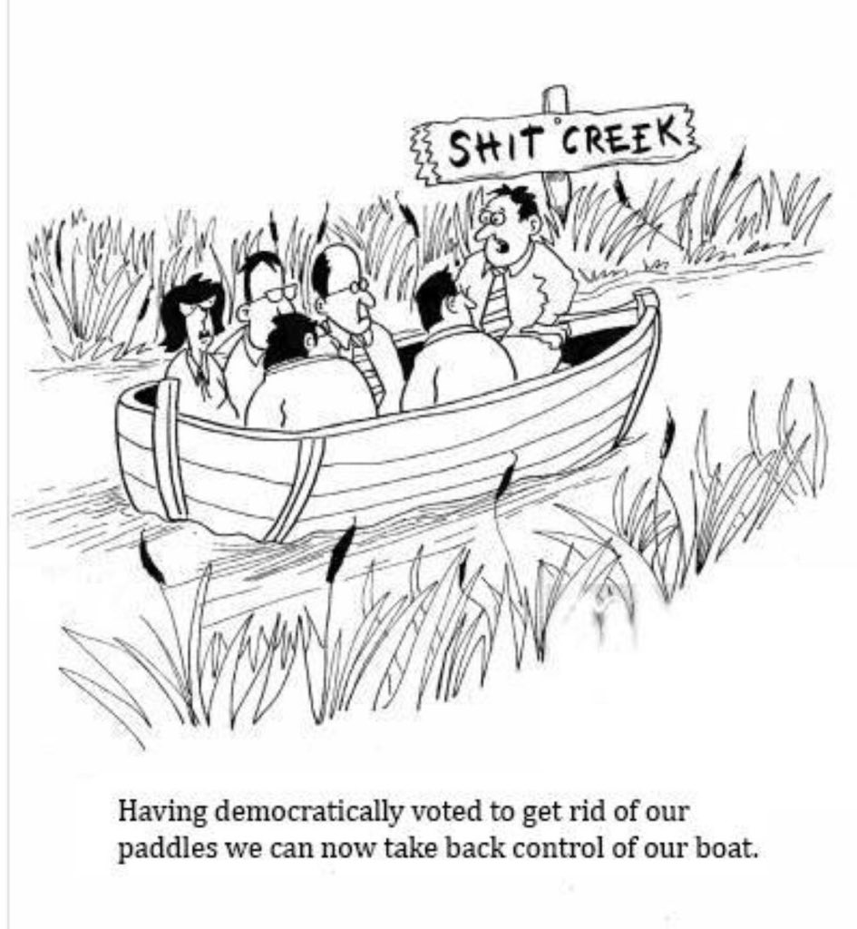 Taking nautical nuances a stage further, I might say that we are truly up faeces creak without the slightest means of locomotion and add that as the Titanic slowly but surely sinks to into the dark depths, the likes of Boris Johnson and William Rees Mogg have long taken to the life boats, whilst Captain May remains on the bridge ordering the crew to change the position of the deckchairs on the sun deck (you get the gist)