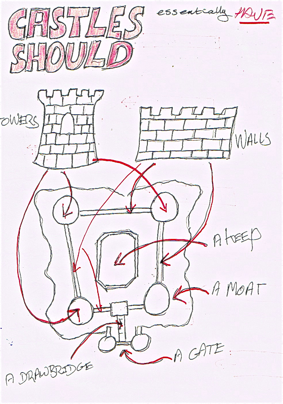 In digging the moat you are going to throw up vast piles of sand. The deeper you dig, the wetter the sand. Damp sand is always best for castle building. With the resulting «mountain» of sand you will build and sculpt the castle’s keep. Towers may be added to the keep, but make sure that your structure can take the weight. Finally comes the buiding of walls between the towers. Ideally, your castle should comprsie the following key elements. (see diagram)