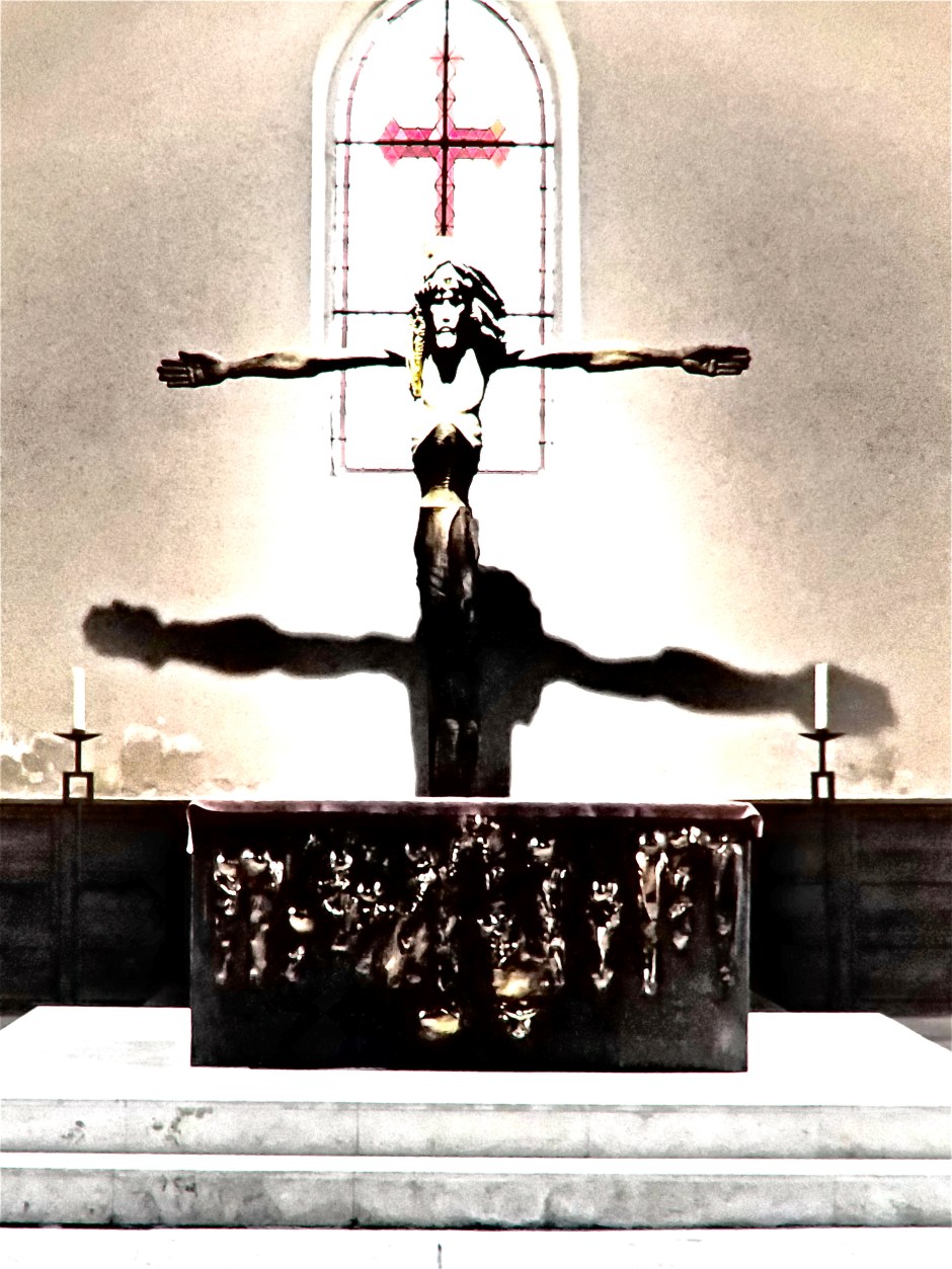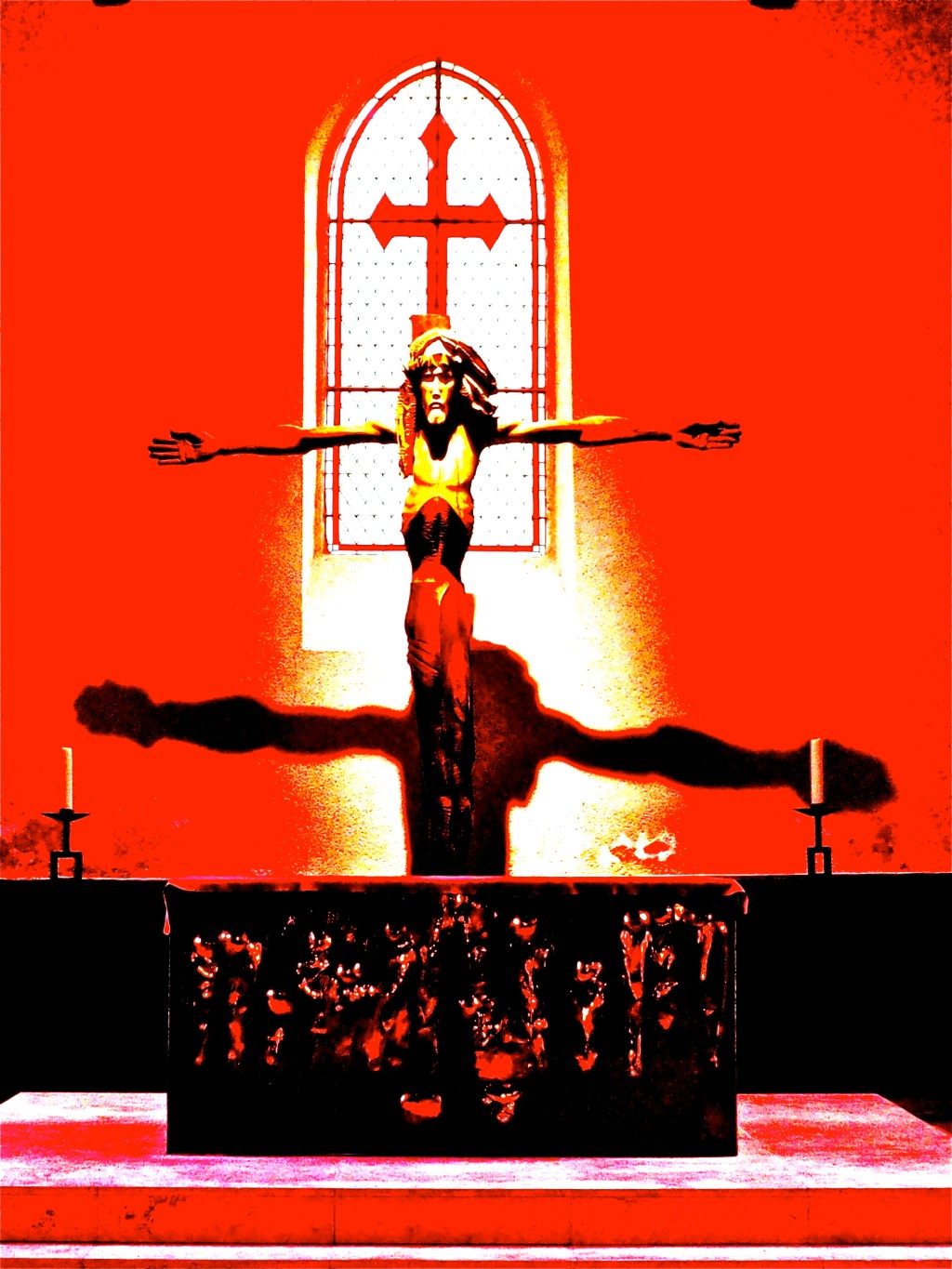 Hell hot Sunday afternoon. Out for a drive, stopped in a small village for a wander and nipped into the coolest place – the church. I’m not religious, but this altar pice was quite striking – a very painful angular modern messiah. I couldn’t resist putting Jesus through a filter, he was just hanging around doing nothing, so I thought he deserved a photo.