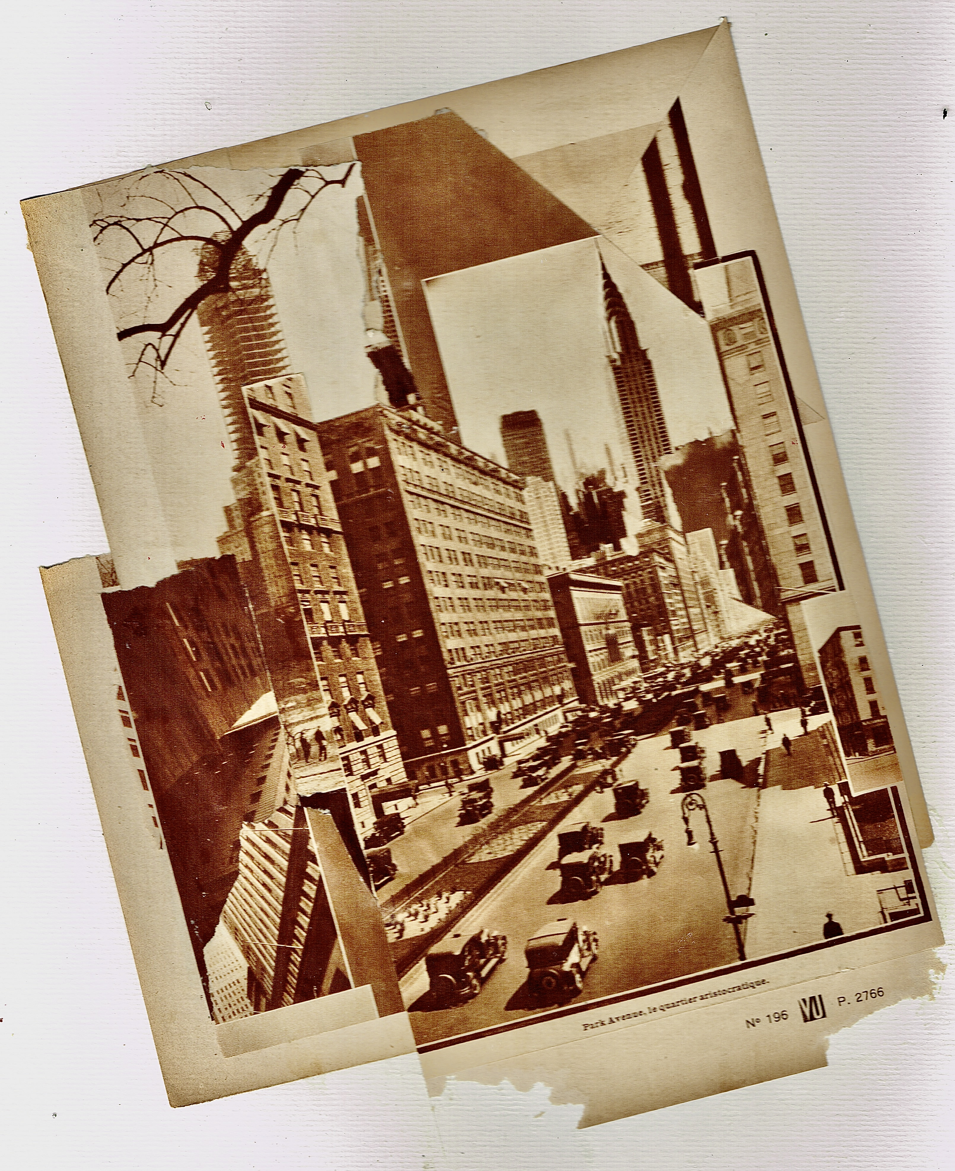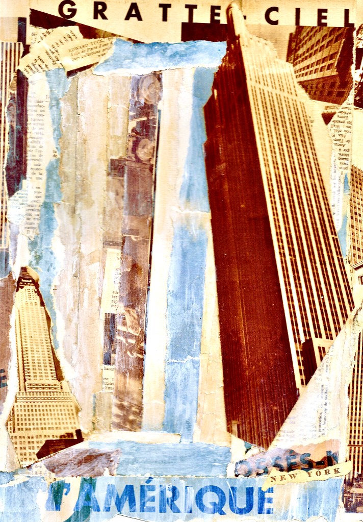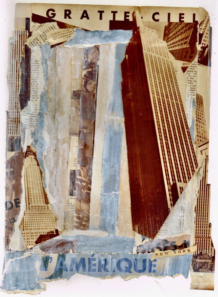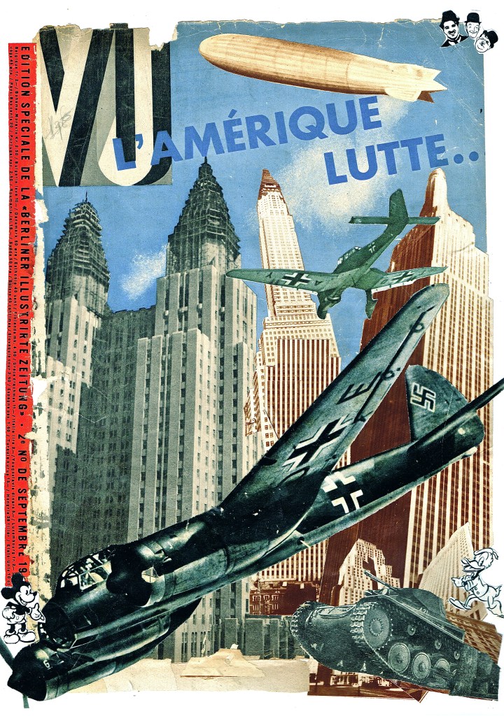 More collages. Ripping up the world to stick it back down the way I want it to look. Making new pictures with old pictures. Here are a few city scapes. Call them “reinterpretations”. All NYC stuff taken from a French magazine called “Vu” – December 1931. (German aircraft from a mamgzine called Signal – 1941 propaganda mag published by the Germans during the Occupation of France) Colour cityscape (with missiles) culled from various 1980s magazines. Happy viewing
