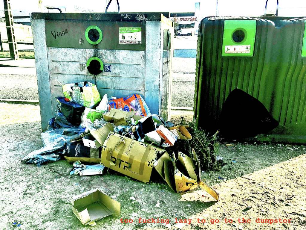 Like it says. “Too F****** lazy to go to the dumpster. In this case, there is a recycling centre on the other side of town, about a ten minute drive. Of course, if you dump your crap illegally at the end of your street, you are not causing pollution by driving your cargo the recycling centre.