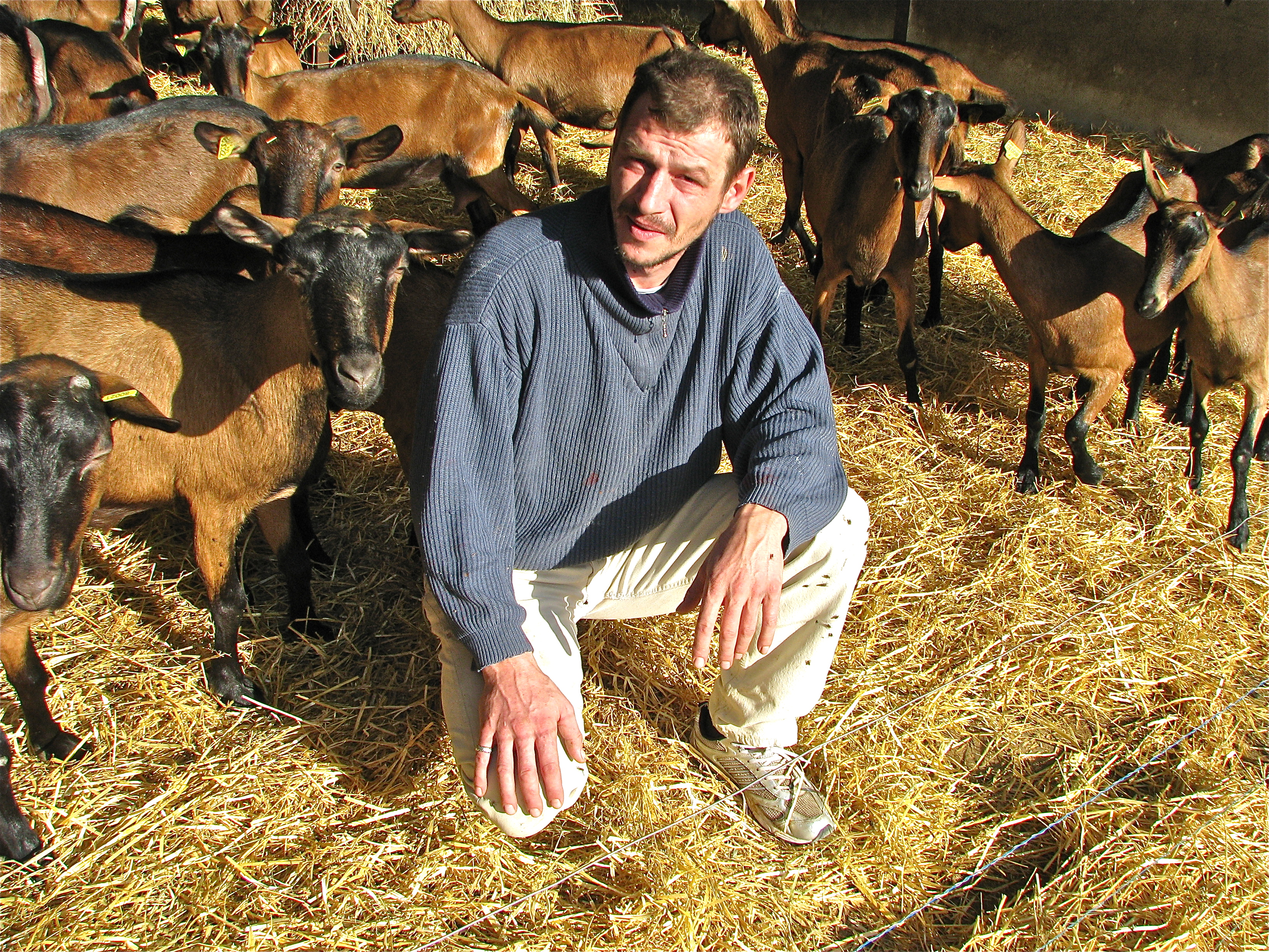 Well, for the Crottin de Chavignol, we use Alpine goats. They have an average life span of about thirteen years. The female goat or Chevrette will reproduce twice in her life. The gestation period for the female is five months. In milk production terms, because don’t forget, I am running a business; a female goat has a viable five year span. There is fifteen months from birth to full milk producing maturity. Of course during this time you don’t know if your chevrette is going to give good yields or not, so you bring them all on the same way. At full maturity, you have to make a choice. Those goats giving low or poor quality yields have to be sold on. I might just get ten Euros for such a goat. However, if I want to buy in new, healthy, fertile and productive goats to boost the herd, they can cost as much as 350 Euros each.